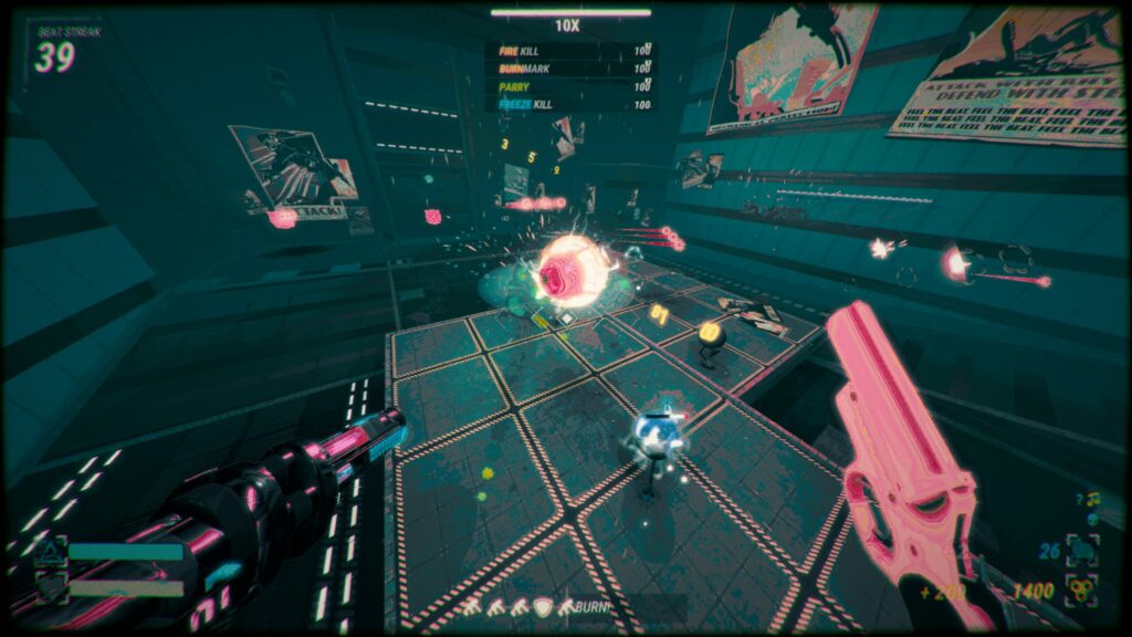 A ROBOBEAT egy gyors tempójú ritmus lövölde, mely egy a fenomenális Beats Per Minute nyomdokaiba lép, és rögtön megjelenéskor egy crossover területtel és zeneszámmal mutatja ki a két fejlesztőcsapat a baráti rivalizálást. Ez a lövölde bizony büntetni fog, ha eltévedünk az ütemtől. Alapjában véve a ROBOBEAT egy procedurálisan generált roguelike játék: akkor indulhatunk meg, ha kiválasztottuk melyik zeneszámra szeretnénk végig tombolni ellenfeleinken. Ez után két random fegyvert kapunk az elérhetőek közül, és egy képességet, ezzel garantálva, hogy egyetlen nekifutásunk sem lesz egyforma, és ez a játékban való előrehaladással, a fegyverek és képességek feloldásával rendkívül változatossá teszi a játékot.