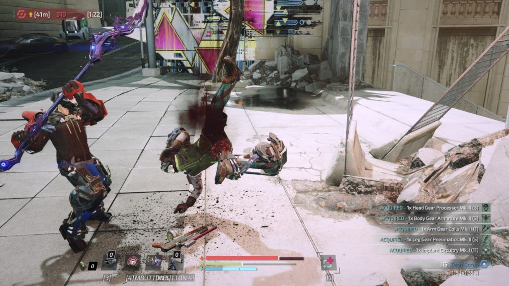 Az akkumulátorunk energiája (amit a különböző felszerelések működtetésére használunk) harc közben tölt. Ütésekkel kapunk bele energiát, vagy néhány esetben meghalt játékostól vagy NPC-től felvehetünk 1-2 töltetet. Ez az engergia, ha nem maradunk combatban vagy nem használjuk el rövid időn belül eltűnik. Két lehetőségünk van: agresszíven harcolunk megállás nélkül vagy kiépítünk egy olyan buildet, ami megakadályoz némi energiavesztést. Mindkét opció egyformán jó, és a felszerelések változatossága lehetőséget ad többféle játékstílus kialakítására.