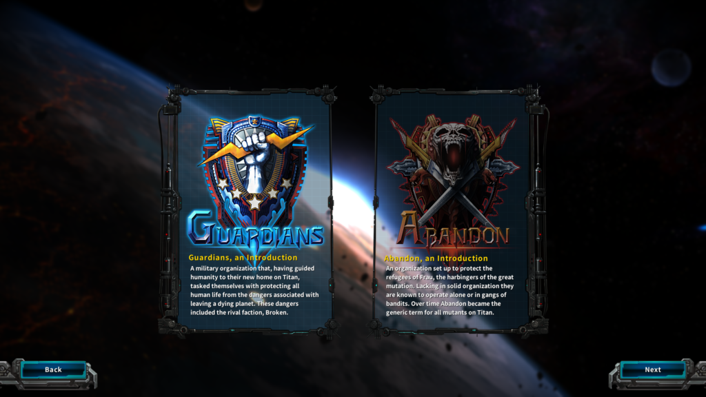 A történet szerint egy Cyborg faj megtámadja az otthonunkat, így kénytelenek vagyunk a galaxis minden sarkából segítséget kérni és katonákat toborozni. Ugyan közös az ellenség, a két fél mégsem tud szemet hunyni a nézeteltérések felett teljes mértékben és együtt harcolni a megszállók ellen. Míg a Guardians (A védelmezők) a pusztuló Földről segítettek eljutni az embereknek új otthonukra a Titanra, és ott is minden veszély ellen védik őket, addig az Abandon (Az elhagyottak) a Frau menekültjeiért harcolnak, Ők főleg mutánsokból állnak, és idővel minden mutánst közéjük soroltak, akkor is, ha az nem osztotta a szervezet nézeteit.