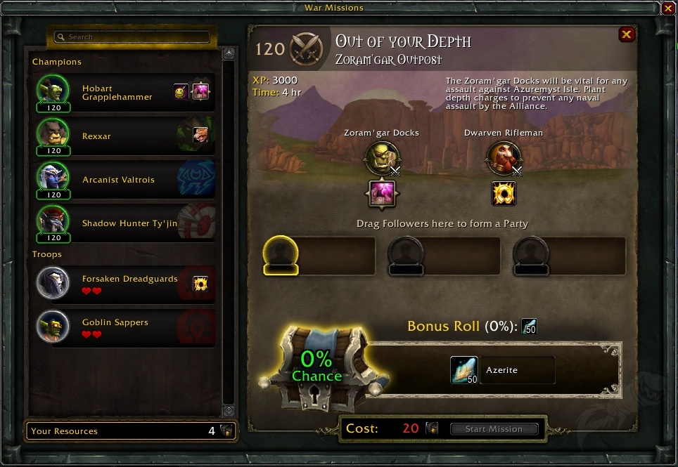 A mission boardokat ezúttal sem úsztuk meg. Mint ahogy Draenor óta minden kiegészítőben, most is gyűjtögethetjük a resourceokat és indíthatjuk az npcket küldetésre. A Legion alatt legalább gold farmolásra lehetett ezeket használni, de jelenleg elenyésző a reward amit ad, így szerintem még ennyi értelme sincs a dolognak. A professionök is változásokon mentek keresztül. Már nem egy nagy számot kell növelni, hanem más-más skilleket kell felhúzni 150-ig. Jelenleg például a Zandalari <craft neve> a hordánál az aktuális skill szint. Sokat szerintem nem módosít a dolgokon, inkább csak a skill capet csökkenti és így hamarabb elkezdhetjük csillagozni a recepteket. Fontos megjegyezni, hogy pl a gathering professionöket hiába maxoltuk ki legionba, ha nem tanuljuk meg a jelenlegi szakma szintet, akkor nem kapunk érte skillt begyűjtéskor. Fura, de „ez van”.