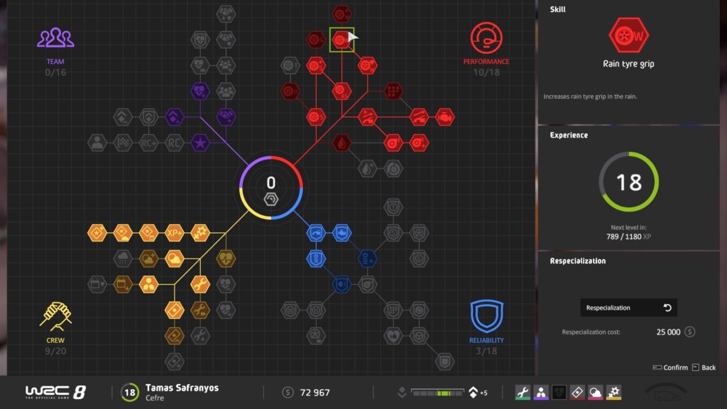 Négy fő pont szerint találhatunk megnyitható talenteket: Team, Crew, Reliabiliy, Performance. A Team részben főként a személyi részlegünk számát és minőségét növelhetjük (de úgy igazából szinte semmit nem pakoltam ide a játék végére és nem éreztem magam nagy hátrányban miatta). A Crew már egy kicsit fontosabb volt számomra, hiszen a pénzügyekbe és a javításba segített be nagyon (amire a kezdeti versenyek alatt igen nagy szükségem volt). Ami csalódást okozott, hogy nagyon korán kiraktam a perk szerzését növelő talentet, de szerintem akkor se kaptam volna többet ha egyet sem rakok ki. Reliability részen teljes mértékben az alkatrészek élettartamát növelhetjük, míg a Performance részben a működésük hatékonyságát.